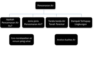 Dokumen tersebut membahas tentang pencemaran air, yang dapat terjadi dari sumber langsung maupun tidak langsung. Pencemaran air dapat menyebabkan berbagai dampak buruk bagi lingkungan dan kesehatan manusia. Untuk mendapatkan air minum yang sehat, dianjurkan merebus atau menggunakan sinar matahari. Analisis kualitas air dapat dilakukan secara sederhana maupun di laboratorium.