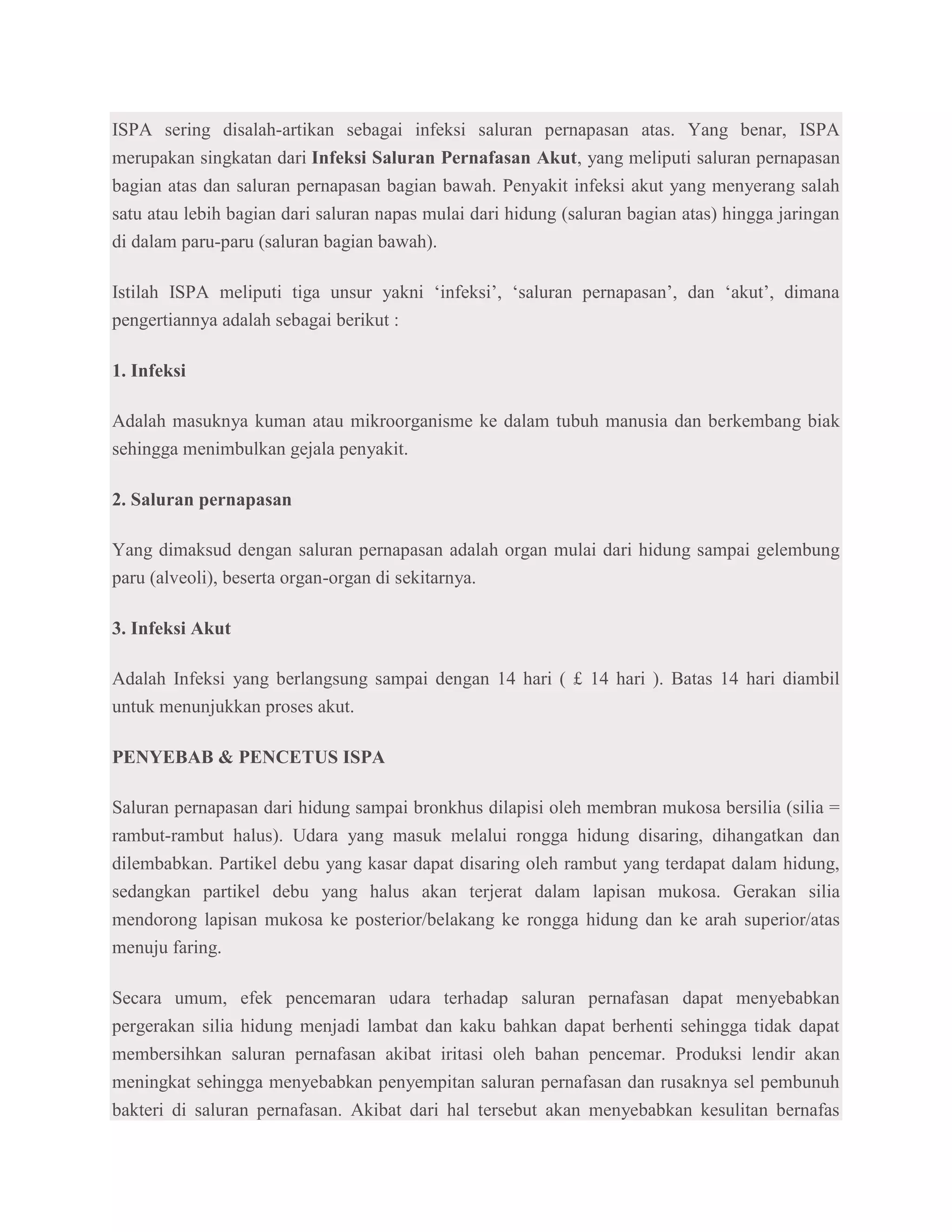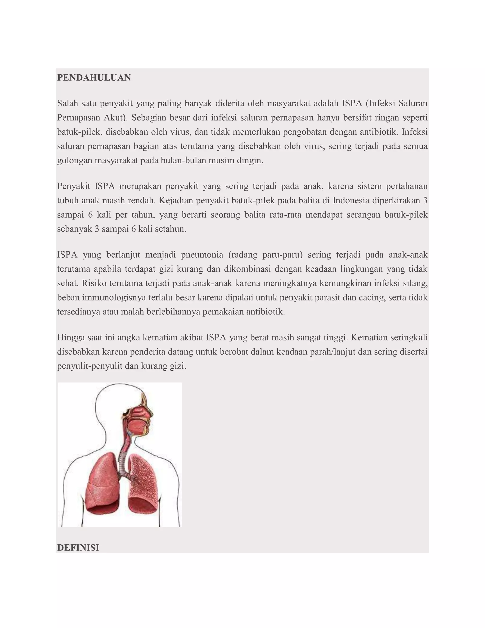Infeksi Saluran Pernapasan Akut (ISPA) adalah penyakit umum, terutama pada anak-anak, yang umumnya bersifat ringan dan disebabkan oleh virus, tetapi dapat berlanjut menjadi pneumonia pada kondisi tertentu. Penyakit ini dapat menular melalui saliva dan udara, dan gejala berpotensi memburuk menjadi kegagalan pernapasan jika tidak diobati dengan tepat. Pencegahan ISPA meliputi menjaga gizi, kebersihan, dan melakukan imunisasi.
