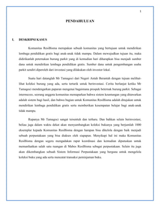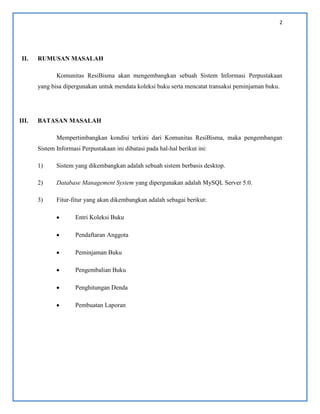 Komunitas ResiBisma berencana membangun perpustakaan dengan koleksi 1000 buku yang disumbangkan oleh investor. Mereka akan mengembangkan sistem informasi perpustakaan berbasis desktop untuk mendata koleksi buku, mendaftar anggota, dan mencatat transaksi peminjaman serta pengembalian buku. Sistem ini bertujuan mengelola perpustakaan agar bisa diakses masyarakat luas.