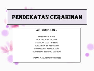 Pendekatan cerakinan dalam pengajaran bahasa Melayu adalah berasaskan prinsip analisa, yang membahagikan ayat kepada bahagian-bahagian kecil untuk memudahkan murid dalam membaca dan mengeja. Terdapat empat peringkat latihan yang meliputi menyebut perkataan, membatangkan perkataan kepada suku kata, serta membina dan membaca ayat sempurna. Pendekatan ini mengintegrasikan kaedah perkataan, rangkai kata, dan ayat dalam satu kaedah bernama kaedah pandang sebut.