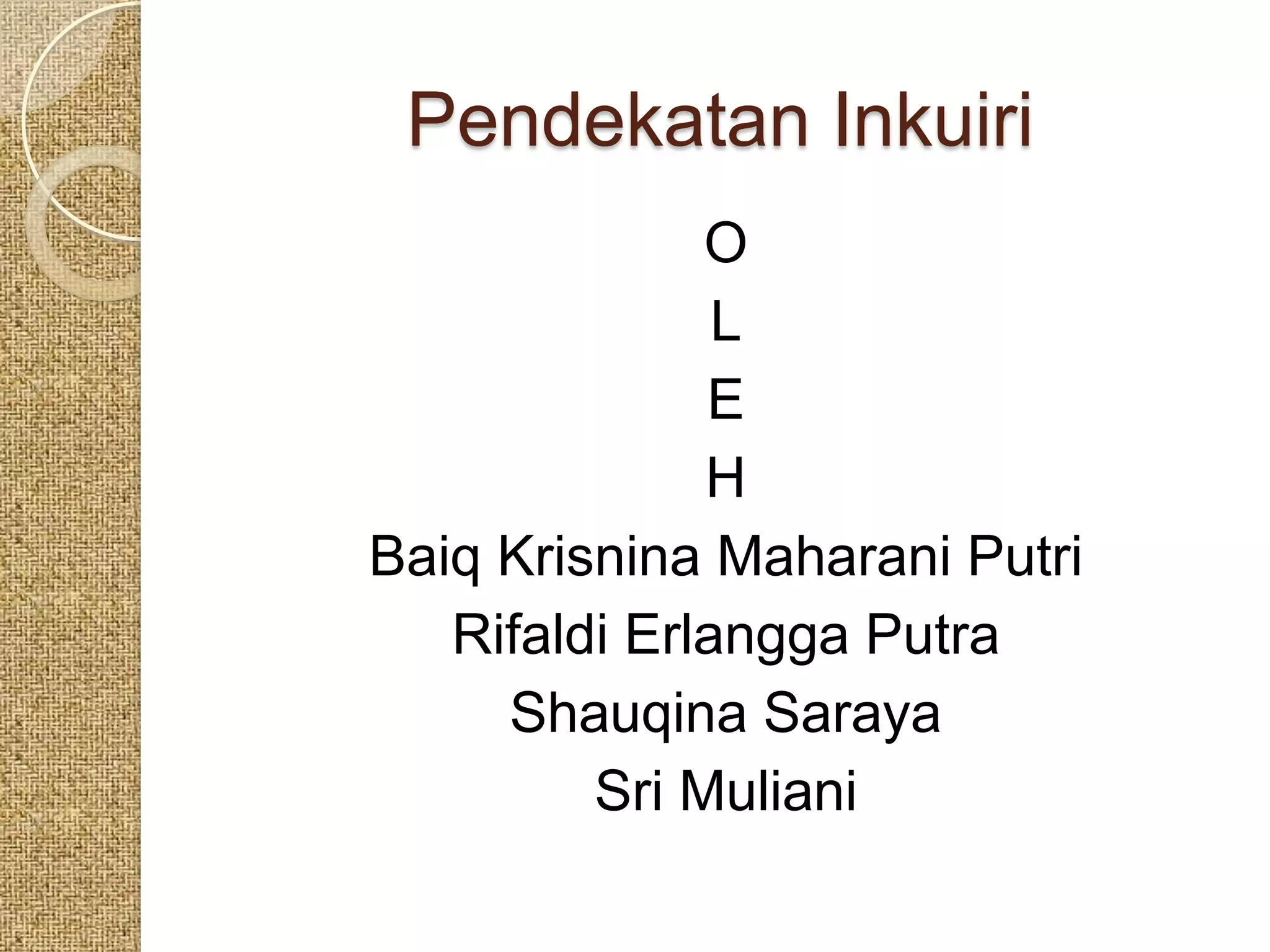 Pendekatan inkuiri adalah metode pembelajaran yang memfokuskan pada keterlibatan siswa dalam menemukan konsep melalui proses eksperimen dan pemecahan masalah. Dalam pendekatan ini, siswa diharapkan aktif bertanya, merumuskan hipotesis, melakukan investigasi, dan menganalisis data, sementara guru berfungsi sebagai pembimbing. Meskipun pendekatan ini memiliki banyak kelebihan, seperti mendorong inisiatif dan belajar sesuai gaya masing-masing, juga terdapat kekurangan seperti kesulitan dalam mengontrol dan merancang pembelajaran.