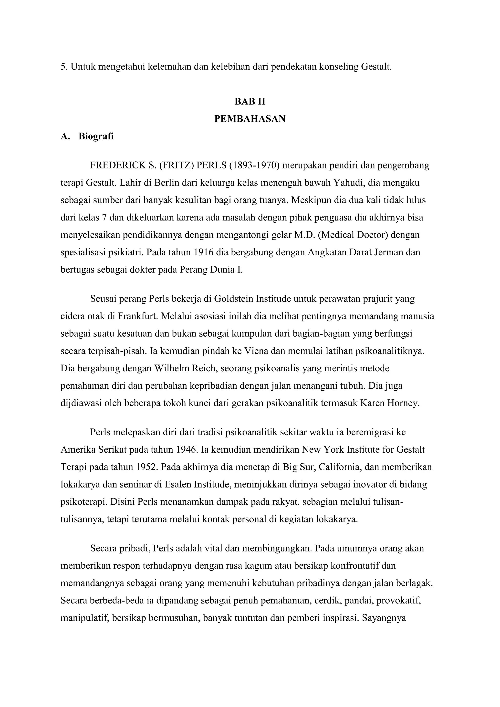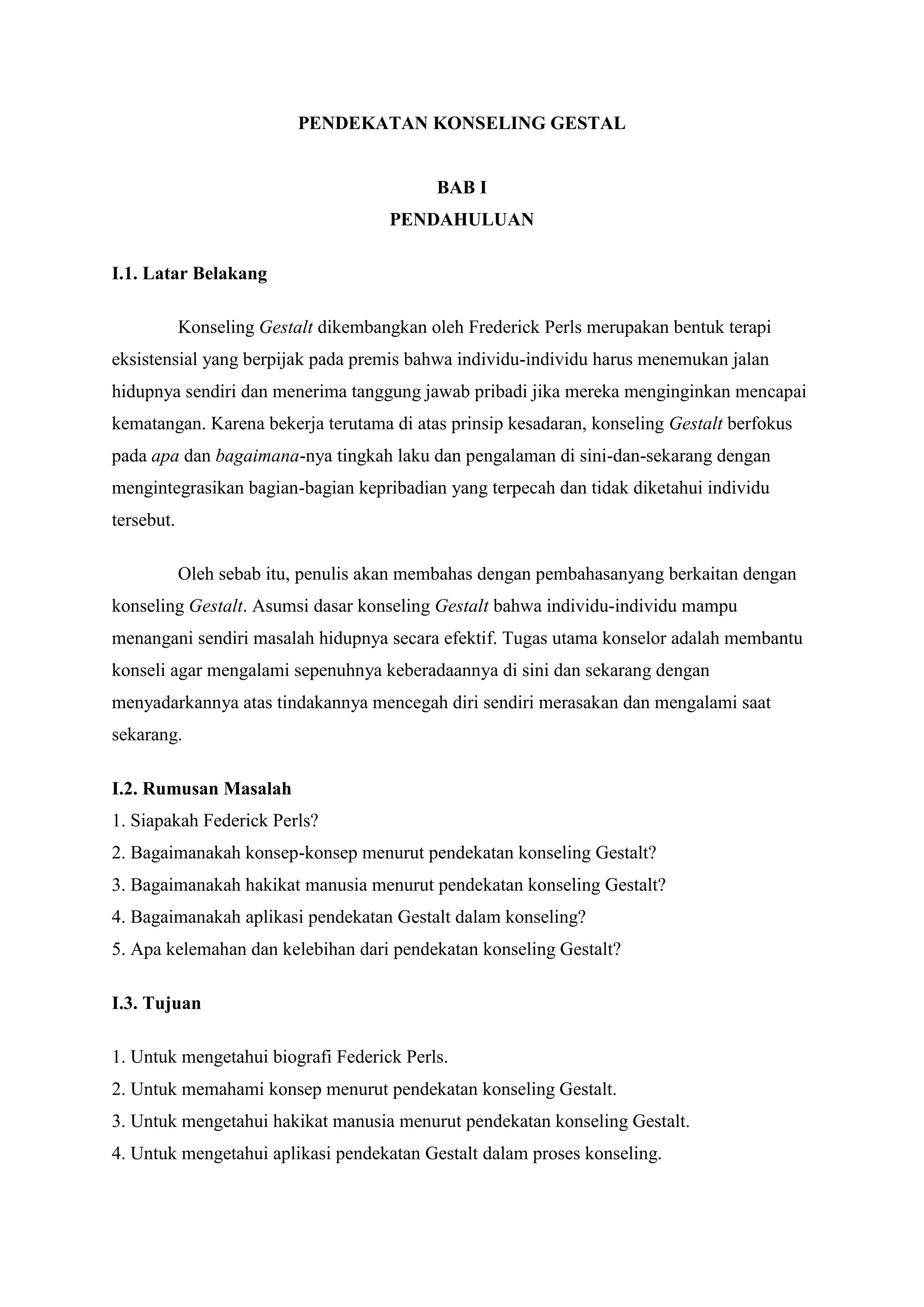 Dokumen ini membahas pendekatan konseling gestalt yang dikembangkan oleh Frederick Perls, dengan fokus pada kesadaran individu saat ini dan tanggung jawab pribadi dalam mengatasi masalah hidup. Hal ini mencakup biografi Perls, konsep dan aplikasi pendekatan gestalt dalam konseling, serta kelebihan dan kelemahan dari metode ini. Konseling gestalt bertujuan membantu individu mencapai kesadaran diri yang lebih baik dan menghadapi 'urusan yang tak selesai' dalam kehidupan mereka.