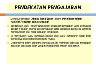 Dokumen membincangkan pelbagai pendekatan pengajaran menurut Ahmad Mohd Salleh dalam pendidikan Islam, termasuk kesepaduan, induktif, deduktif, dan eklektif. Setiap pendekatan menyokong pemahaman pelajar melalui tanggapan asas dan prinsip amalan bilik darjah. Pendekatan kesepaduan menekankan interkoneksi antara mata pelajaran, manakala induktif dan deduktif membantu pelajar memahami dan mengkategorikan konsep melalui contoh yang diberikan.