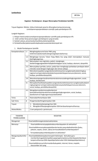 Lembar kerja ini merancang kegiatan pembelajaran IPS menggunakan pendekatan saintifik untuk mencapai kompetensi dasar tertentu. Kegiatannya meliputi mengamati, menanya, mengumpulkan informasi, mengasosiasikan, dan mengomunikasikan tentang sumber daya alam dan potensi serta pemanfaatannya di daerah masing-masing. Peserta didik akan dibagi kelompok untuk mengumpulkan data dan berdiskusi, lalu mempresentasikan hasil anal