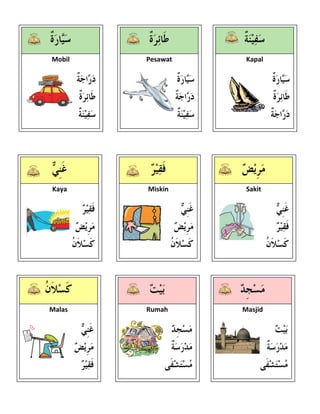Dokumen tersebut memberikan daftar berbagai benda, profesi, kondisi, tempat, dan makhluk hidup seperti buah, sayuran, kendaraan, pekerjaan, kondisi manusia, bangunan, alat tulis, furnitur, benda alam, bagian tubuh, unsur, dan hewan.