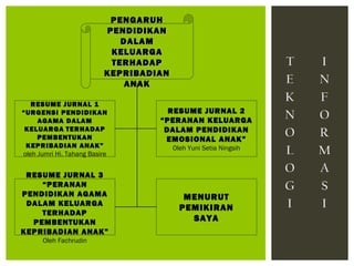 Dokumen ini membahas pentingnya pendidikan agama dalam keluarga bagi pembentukan kepribadian anak, menekankan bahwa pendidikan ini harus diajarkan sejak dini untuk mempengaruhi sikap dan perilaku anak secara positif. Selain itu, hubungan emosional yang baik antara orang tua dan anak serta pengajaran akhlak juga berperan penting dalam perkembangan kepribadian anak. Keluarga memiliki tanggung jawab besar dalam menyiapkan generasi yang mampu menghadapi tantangan dan perkembangan zaman dengan nilai-nilai agama yang kuat.