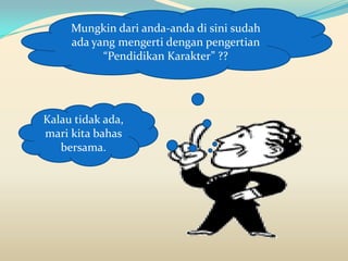 Dokumen tersebut membahas tentang pendidikan karakter, termasuk pengertian, nilai-nilai karakter, dan pentingnya pendidikan karakter. Pendidikan karakter bertujuan untuk membentuk siswa menjadi mandiri, beriman, berilmu, berakhlak mulia, sehat, cakap, kreatif, dan menjadi warga negara yang demokratis serta bertanggung jawab.