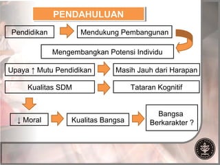 Dokumen ini mengkaji kelemahan sistem pendidikan di Indonesia yang tidak mampu membentuk karakter bangsa, dengan fokus pada rendahnya kualitas pendidikan yang diukur dari aspek kognitif tanpa memperhatikan nilai afektif dan psikomotorik. Implementasi kebijakan pendidikan juga dinilai tidak sesuai harapan, mengarah pada penekanan pada hasil akademis dibandingkan dengan pengembangan karakter. Untuk mengatasi masalah ini, dokumen ini merekomendasikan peningkatan peran orangtua, komunikasi antar pihak terkait, dan kebijakan pemerintah yang mendukung pendidikan yang beriman dan berkualitas.