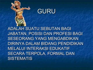 Dokumen ini membahas peranan guru dalam pendidikan dan pengklasifikasian jenis-jenis guru berdasarkan tanggung jawab serta karakteristiknya. Di dalamnya juga dijelaskan tanggung jawab guru menurut UU No. 14/2005 dan nilai-nilai karakter bangsa yang seharusnya dimiliki oleh seorang pendidik. Guru diharapkan mampu mendidik dengan penuh tanggung jawab kepada peserta didik dan masyarakat.