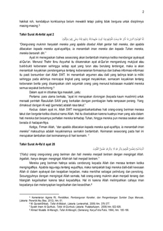 Dokumen ini membahas pentingnya pendidikan ruhani dalam Islam, yang menekankan bahwa manusia terdiri dari unsur jasmani dan ruhani. Berbagai ayat Al-Qur'an dikutip untuk menyoroti hubungan antara iman, ketenangan hati, dan dzikrullah, serta peran pendidikan dalam membentuk kepribadian yang baik. Pemaparan ini meliputi tafsir ayat-ayat yang menggambarkan keadaan orang beriman dan mengajarkan bahwa mengingat Allah akan membawa ketentraman jiwa.