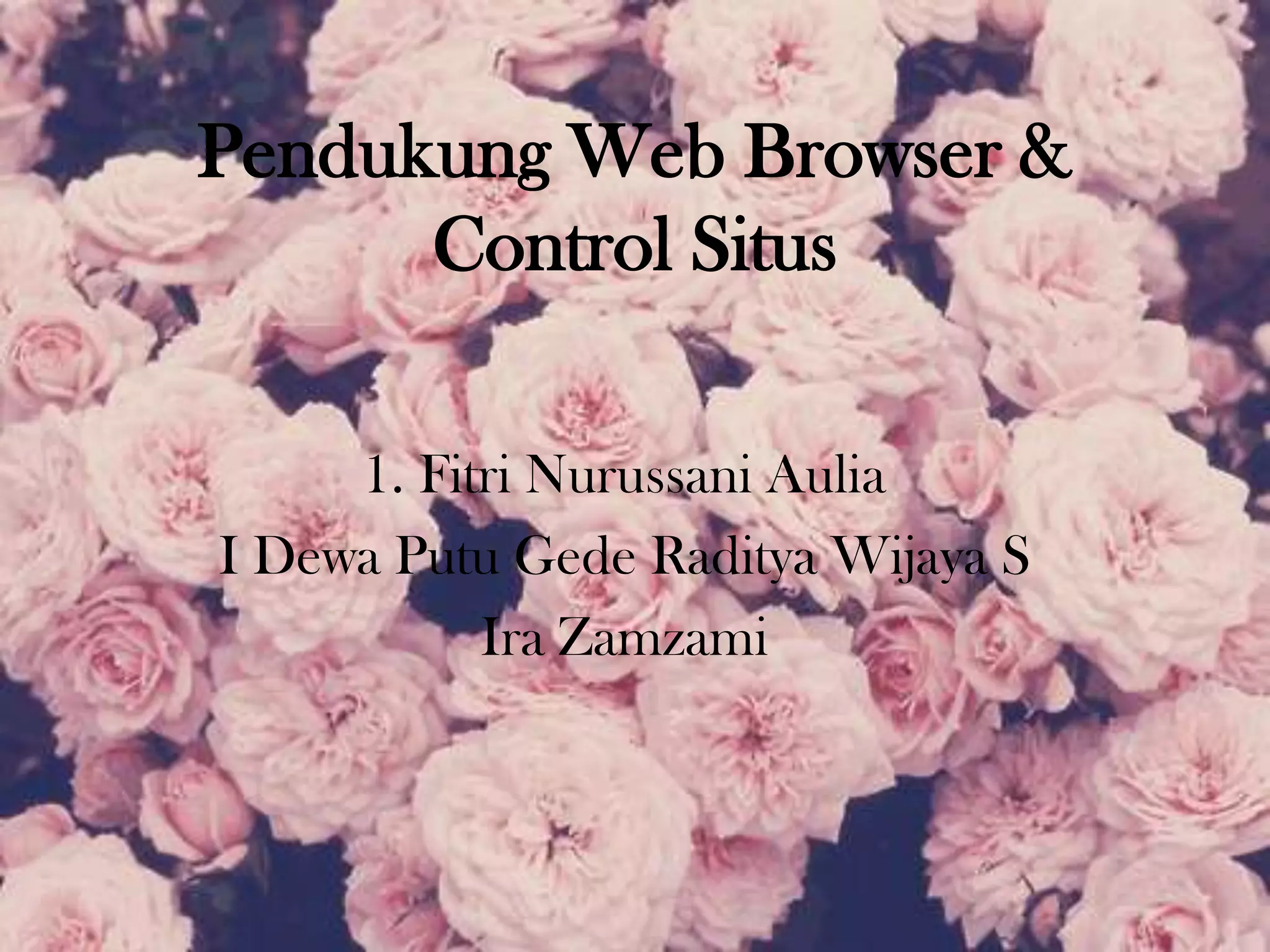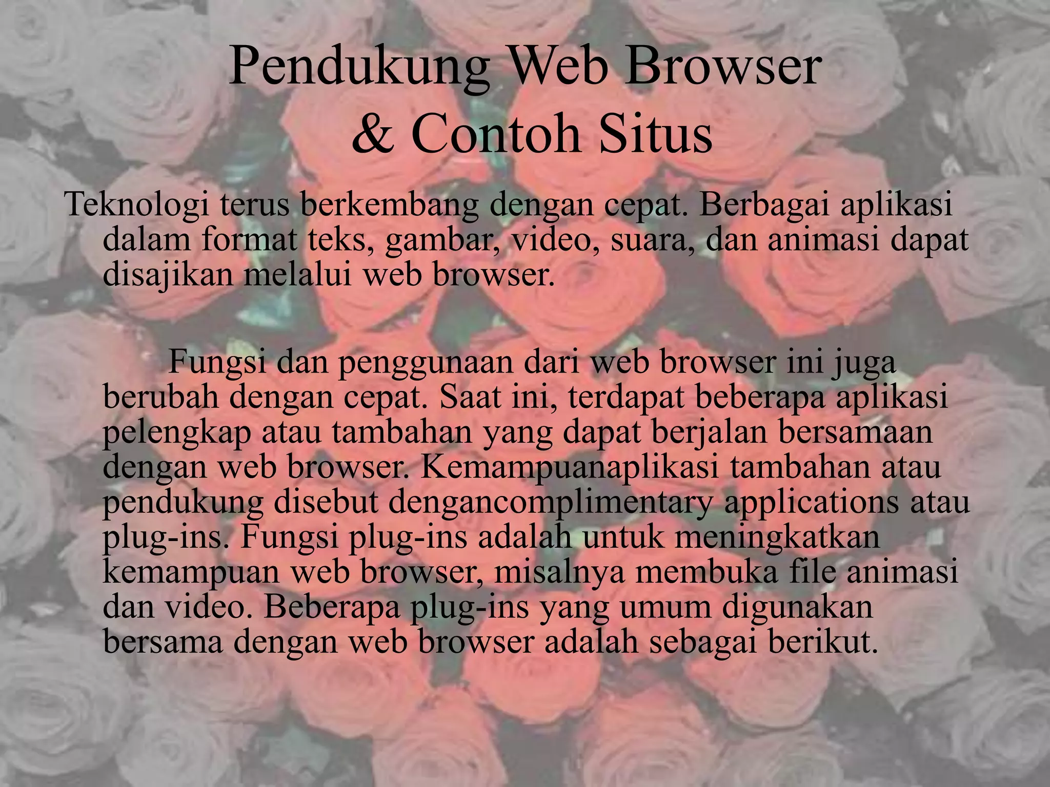 Dokumen tersebut membahas tentang pendukung web browser seperti Flash Player, Shockwave Player, Real Player, Quick Time, dan Acrobat Reader yang berfungsi untuk membuka berbagai format file seperti animasi, audio, video, dan PDF. Dokumen juga menjelaskan fungsi control panel pada hosting web yang memungkinkan pengelolaan berbagai layanan hosting seperti akses log server, penggunaan webspace dan bandwidth, konfigurasi email, pengelolaan FTP dan basis data, serta statistik pengunjung melalui analisis log