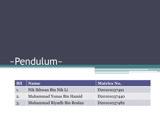 The document describes an experiment to determine the effect of string length on the period of a pendulum. Data was collected using a motion detector as the pendulum swung with string lengths of 20 cm and 10 cm. The period was calculated from the time taken to complete 20 oscillations. The results showed that longer string lengths had longer periods. Gravity was also calculated and had a small percentage error compared to the theoretical value.