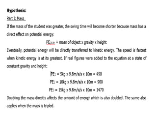 This document provides guidance for designing an experiment to investigate how different factors affect the swing time of a pendulum. The experiment aims to determine the optimal swing height for playground swings by studying how mass, angle, and string length impact the pendulum's period. Students are instructed to test 5 variations of each variable over 3 trials, record their data in a table, and analyze their results to make recommendations.