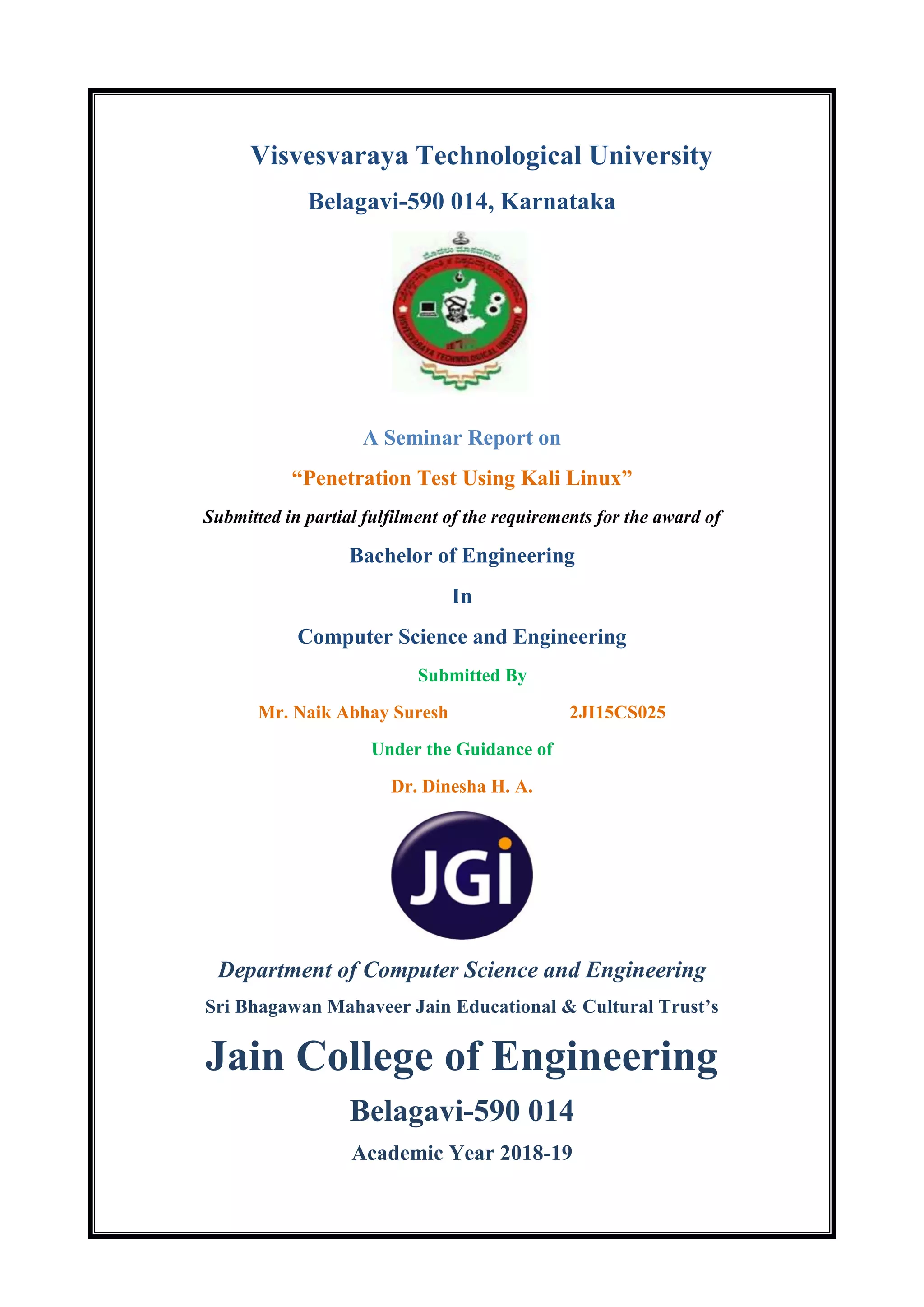 This document is a seminar report submitted by Mr. Naik Abhay Suresh to fulfill requirements for a Bachelor of Engineering degree. The report discusses penetration testing using Kali Linux. It provides background on Kali Linux, including its history and relationship to Debian. It then describes the methodology of penetration testing, including phases such as information gathering, scanning, exploitation, and post-exploitation. The report discusses advantages and applications of using Kali Linux for penetration testing.