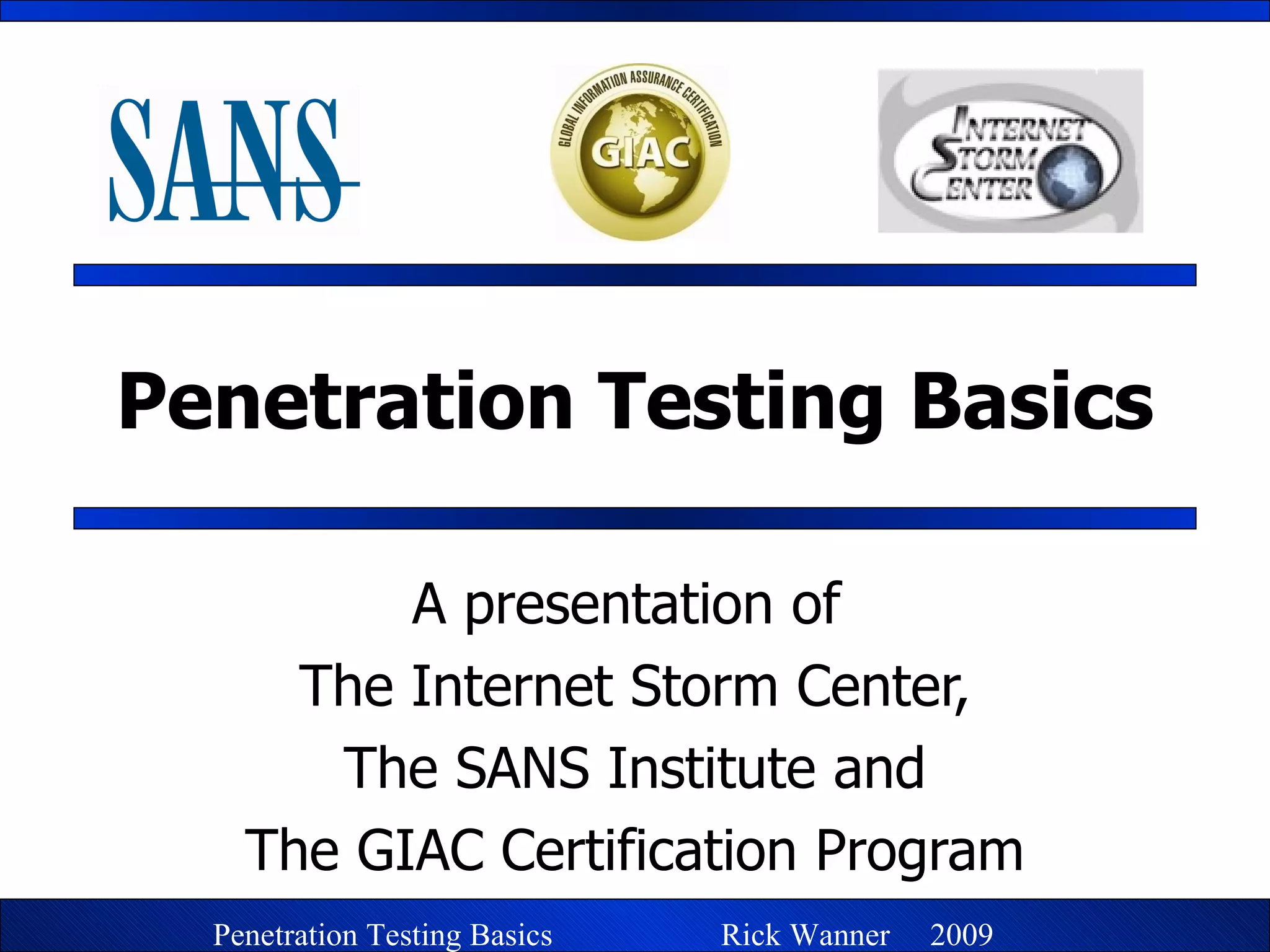 The document provides an overview of penetration testing basics from a presentation by The Internet Storm Center, SANS Institute, and GIAC Certification Program. It discusses the Internet Storm Center, SANS/GIAC training and certifications, common cyber threats, the methodology for penetration testing, tools used for various stages like reconnaissance, scanning, exploitation, and analysis, and the importance of reporting and mitigation strategies.