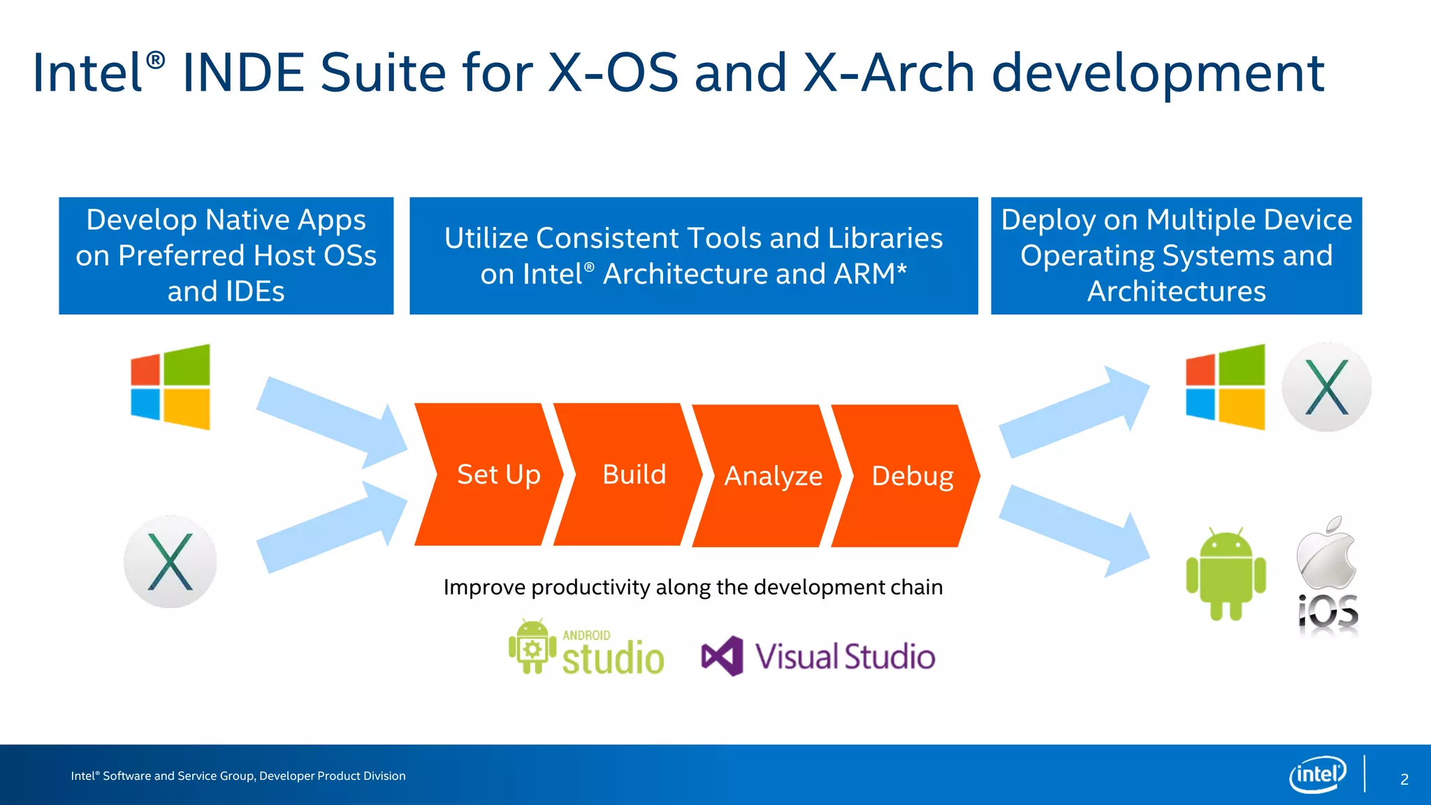 Intel® INDE is a suite of tools that allows developers to write code once and deploy applications to multiple operating systems and architectures. It supports developing native Android and iOS applications using Java on Windows or Mac hosts. The suite provides tools for project setup, UI design, building, debugging on simulators or devices, and cloud builds. It aims to improve productivity by reducing redundant work across OS teams.