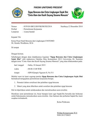 Dokumen ini adalah permohonan kerjasama untuk kegiatan 'sigap bencana dan cinta lingkungan sejak dini' yang akan dilaksanakan oleh mahasiswa Fakultas Ilmu Komunikasi Universitas Dr. Soetomo pada 10 Januari 2015. Kegiatan ini bertema 'cinta alam dan kasih sayang sesama manusia' dan memerlukan pemateri serta materi pelatihan. Panitia mengharapkan kerjasama dari Ketua Pusat Studi Bencana dan Lingkungan Unitomo.