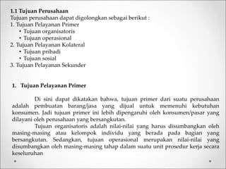 Dokumen tersebut membahas tentang tujuan perusahaan dan manajemen umum. Tujuan perusahaan dapat dibedakan menjadi tujuan primer, kolateral, dan sekunder. Manajemen umum mencakup perencanaan, pengorganisasian, dan pengorganisasian perusahaan untuk mencapai tujuan-tujuannya.