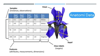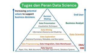 Dokumen ini memperkenalkan konsep dasar data science, menjelaskan pentingnya data dalam era modern, dan menyebutkan langkah-langkah dalam menyelesaikan masalah menggunakan data science. Mencakup definisi, siapa itu data scientist, komponen utama, serta proses seperti discovery, data preparation, model planning, dan operationalize. Selain itu, dokumen ini juga menggambarkan bagaimana data dapat dianalisis untuk menemukan wawasan yang berguna dalam berbagai konteks.