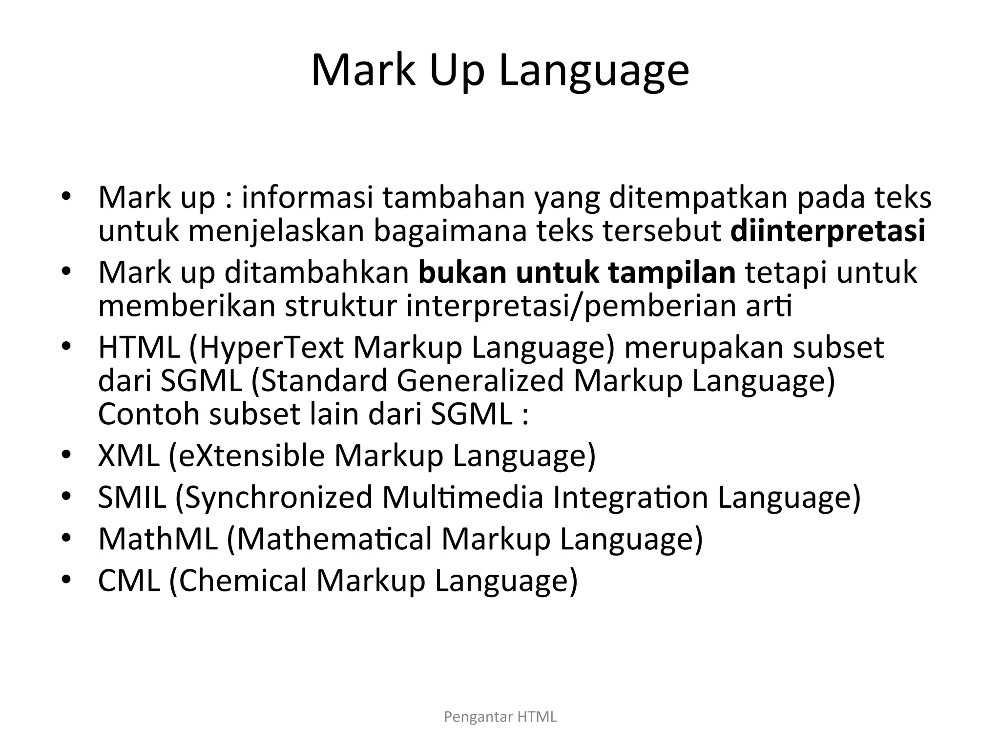 Dokumen ini memberikan pengantar tentang HTML sebagai bahasa markup untuk dokumen web, menjelaskan struktur, tag dasar, dan cara penulisan yang benar. HTML adalah subset dari SGML dan terdiri dari elemen yang menggunakan tag untuk memberi makna pada teks. Beberapa contoh tag yang dijelaskan termasuk tag untuk header, paragraf, dan format teks seperti bold dan italic.