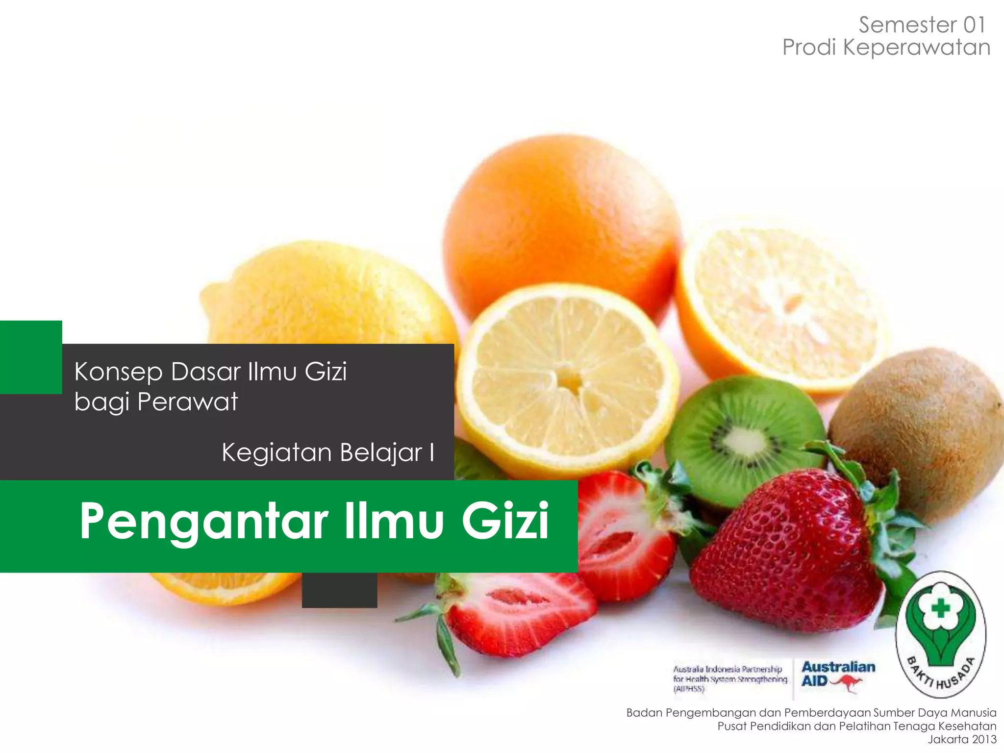 Dokumen ini membahas konsep dasar ilmu gizi untuk perawat, mencakup pengertian ilmu gizi sebagai ilmu yang mempelajari hubungan antara makanan dengan kesehatan, ruang lingkup ilmu gizi, dampak kekurangan dan kelebihan gizi, serta kebutuhan zat gizi untuk menjaga kesehatan tubuh.