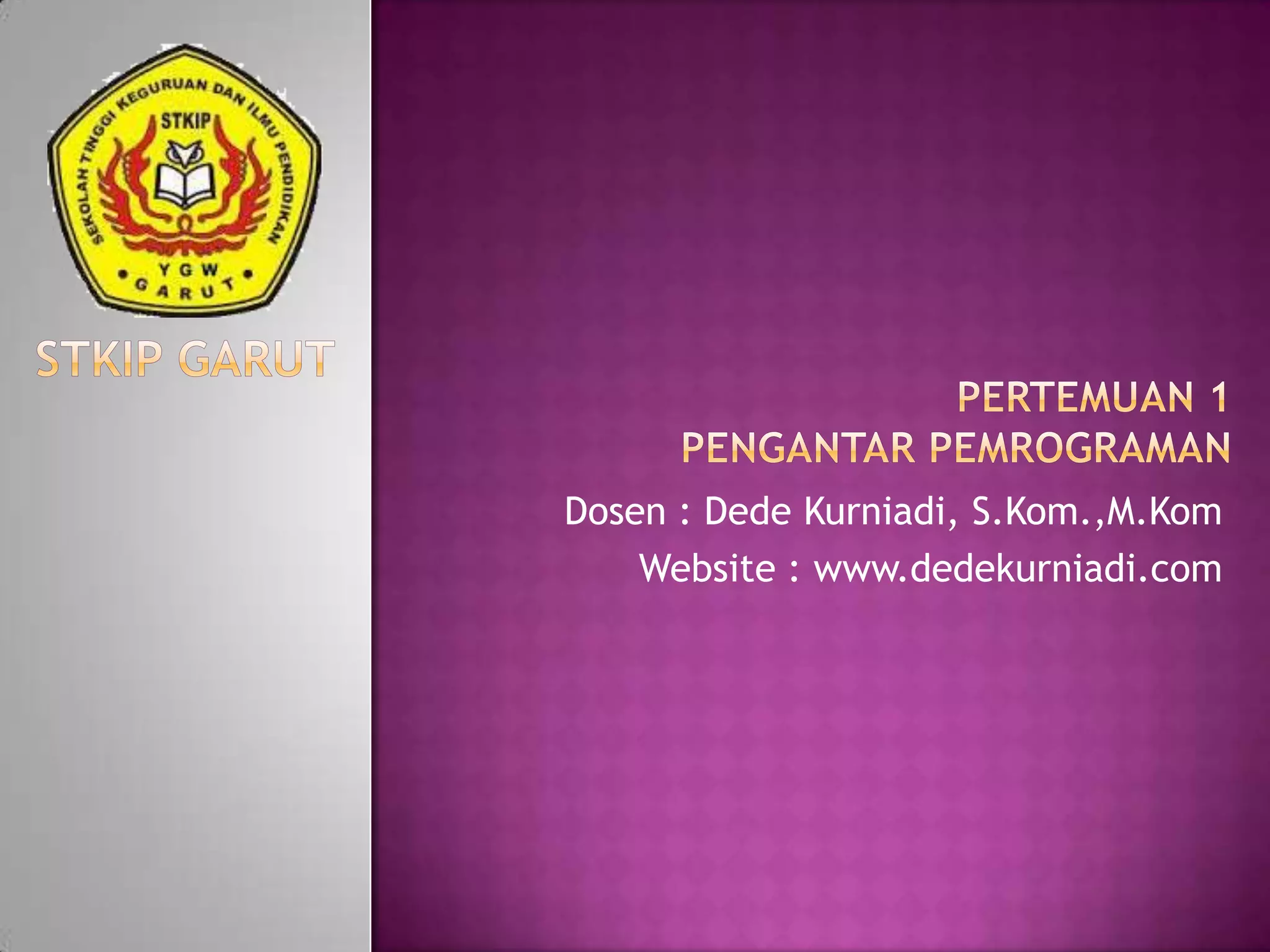 Dokumen ini membahas tentang konsep dasar pemrograman meliputi algoritma, flow chart, pseudo code, dan implementasi pemrograman dengan bahasa C/C++. Materi kuliah mencakup dasar-dasar pemrograman, penyeleksian kondisi, perulangan, fungsi, array, string, pointer dan struktur. Mahasiswa diharapkan mampu menyelesaikan masalah menjadi algoritma, flowchart, dan program komputer menggunakan konsep pemrograman prosedural.