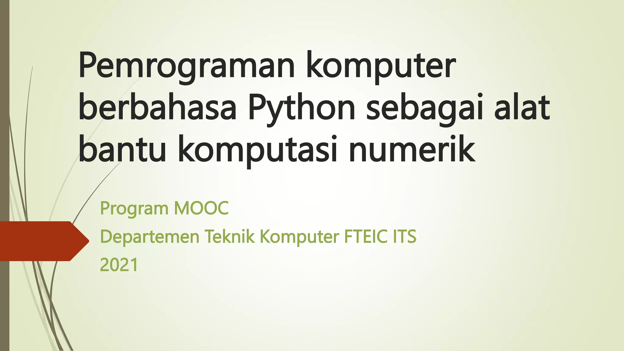 Dokumen tersebut membahas tentang pemrograman komputer menggunakan bahasa Python sebagai alat bantu komputasi numerik. Python merupakan bahasa pemrograman interpretatif multiguna yang mudah dipelajari dan mendukung beberapa paradigma pemrograman. Dokumen ini juga menjelaskan sintaks dasar, input output data, operator, kendali cabang dan perulangan dalam Python.