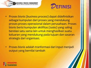 Dokumen tersebut membahas pengelolaan dan pengembangan organisasi serta SDM berbasis perbaikan proses bisnis. Dokumen tersebut menjelaskan tentang definisi proses bisnis, tujuan, manfaat, sasaran, dan keluaran dari pengelolaan proses bisnis secara optimal untuk meningkatkan kinerja bisnis perusahaan.
