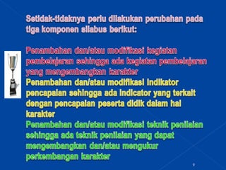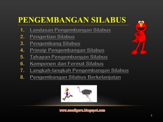 Dokumen ini merupakan panduan pengembangan silabus yang menjelaskan definisi, komponen, tahapan, dan prinsip pengembangan silabus dalam pendidikan. Silabus berfungsi sebagai rencana pembelajaran yang mencakup standar kompetensi, kompetensi dasar, materi, penilaian, dan sumber belajar, serta diatur oleh peraturan pemerintah. Pengembangan silabus dilakukan secara berkelanjutan dengan memperhatikan evaluasi hasil belajar dan perkembangan peserta didik.