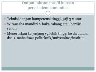 Dokumen ini mengemukakan saran pengembangan akademi komunitas di Indonesia untuk periode 2011-2015, termasuk rekomendasi tentang pemilihan program studi dan sistem pembelajaran. Fokus utamanya adalah menghasilkan lulusan yang kompeten dan siap kerja melalui kerjasama dengan industri serta peningkatan fasilitas pendidikan. Strategi pengembangan juga mencakup sinergi dengan pemerintah daerah dan evaluasi berkelanjutan untuk memenuhi kebutuhan pasar tenaga kerja.
