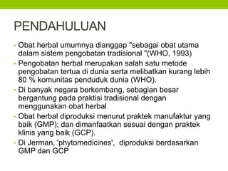 Dokumen tersebut membahas pengembangan obat herbal, mulai dari definisi obat herbal menurut WHO, penggunaan obat herbal di berbagai negara, tahapan pengembangan obat herbal meliputi seleksi, uji preklinik, standarisasi, uji klinik, serta contoh beberapa obat herbal.
