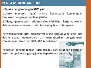 Dokumen ini membahas pengembangan sumber daya manusia (SDM) yang bertujuan untuk menutup kesenjangan antara kemampuan karyawan dan kebutuhan jabatan sambil meningkatkan efisiensi kerja. Program orientasi dan pelatihan merupakan bagian penting dari pengembangan SDM untuk memperkenalkan karyawan baru dan meningkatkan keterampilan mereka secara berkelanjutan. Penggunaan sistem informasi sumber daya manusia juga disebutkan sebagai alat untuk mengelola data personalia dan mendukung pengembangan SDM di organisasi.