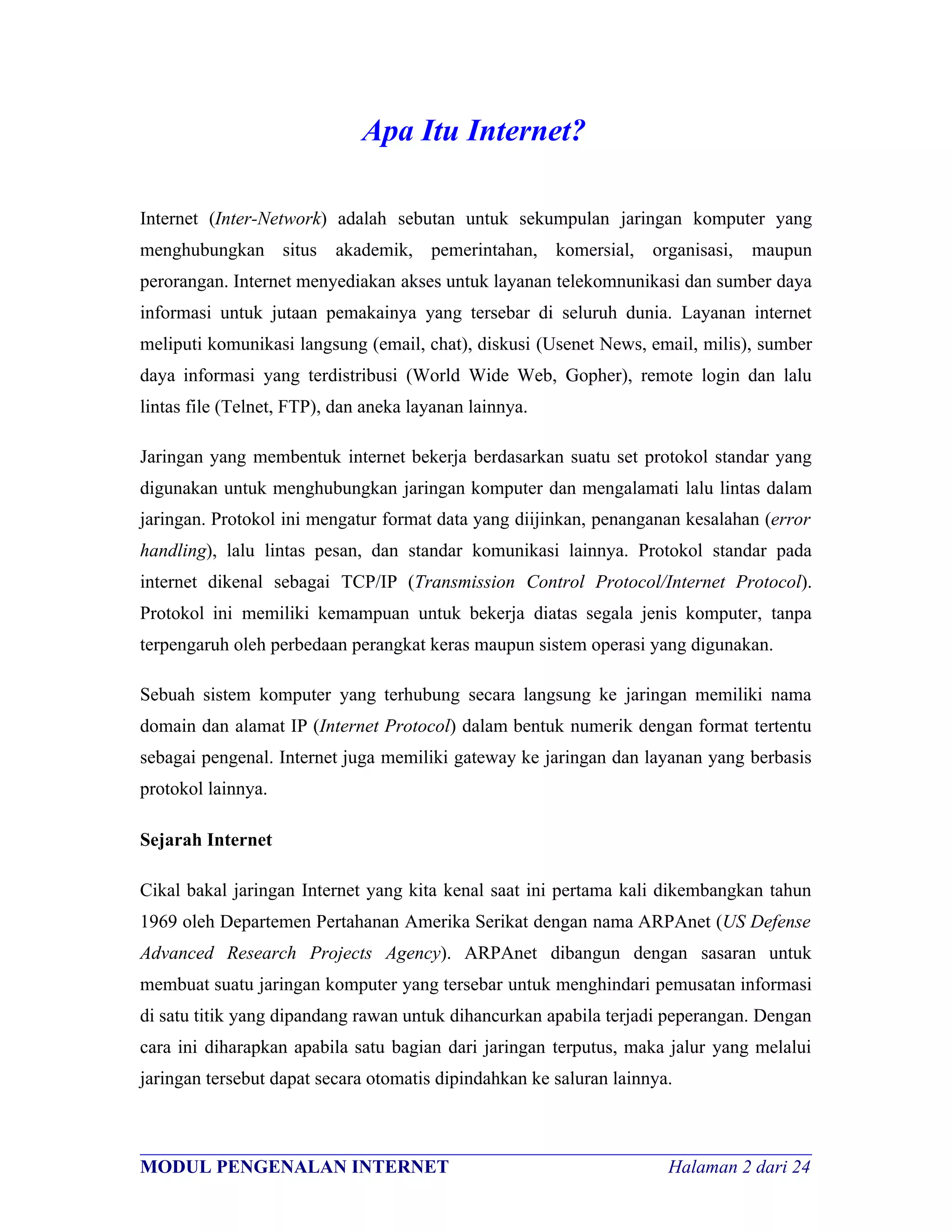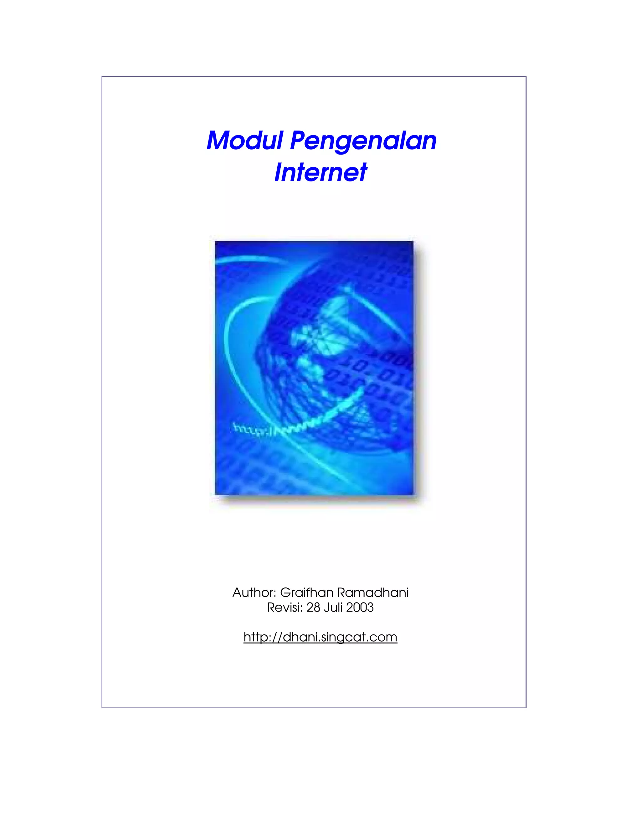 Dokumen ini menjelaskan pengenalan dan sejarah internet, termasuk protokol TCP/IP, layanan yang ditawarkan seperti email dan World Wide Web, serta aplikasi-aplikasi internet yang umum digunakan. Internet awalnya dikembangkan oleh Departemen Pertahanan AS pada tahun 1969 dan kemudian mengalami perkembangan pesat termasuk adopsi komersial. Di Indonesia, akses internet komersial mulai dikenal pada tahun 1994, dengan layanan yang semakin beragam seiring perkembangan teknologi.