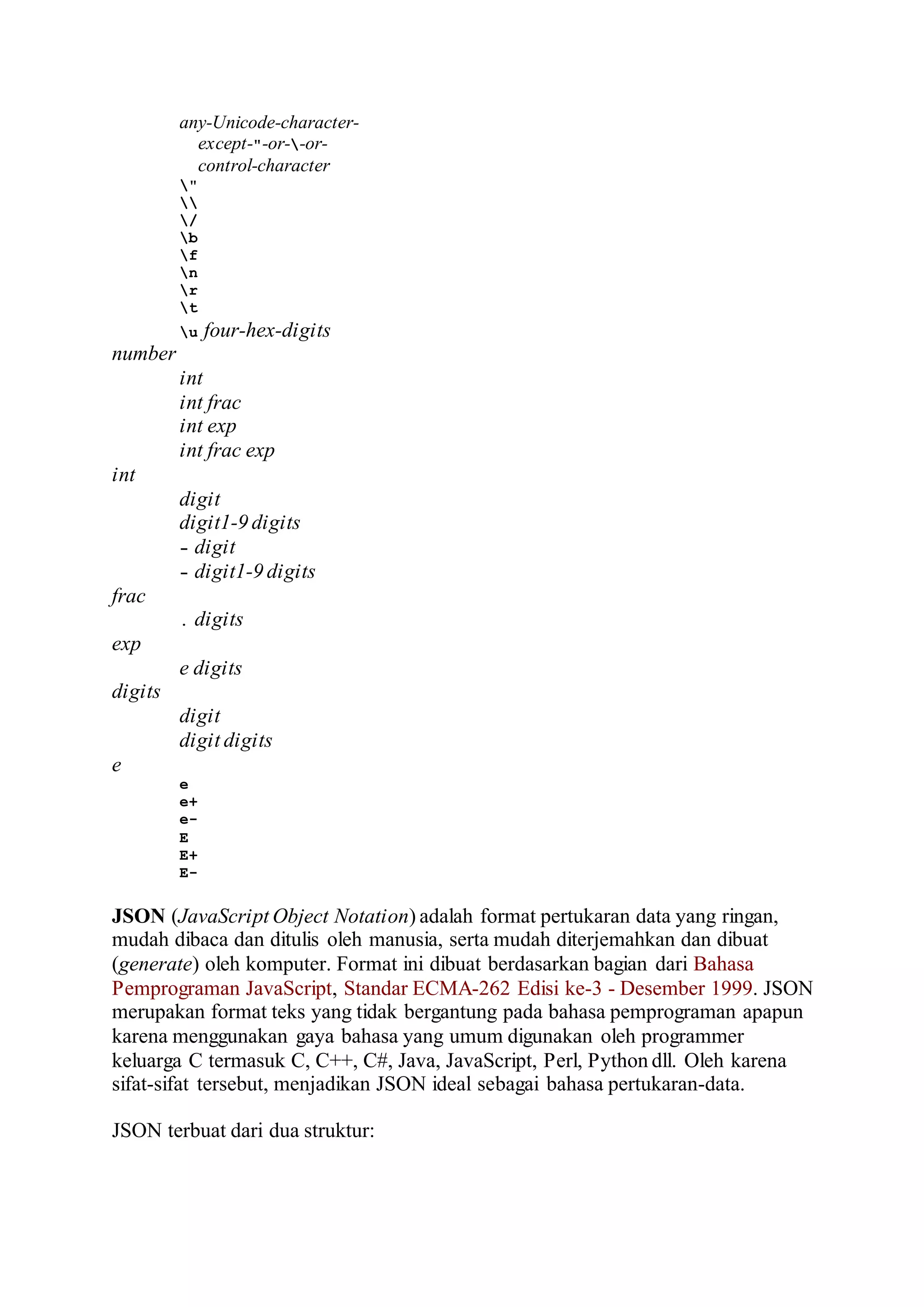 Dokumen tersebut membahas pengantar mengenai JSON (JavaScript Object Notation), yaitu format pertukaran data ringan yang banyak digunakan untuk mentransmisikan data terstruktur melalui jaringan. JSON dirancang berdasarkan subset bahasa JavaScript dan memungkinkan representasi struktur data sederhana seperti objek dan array. Dokumen tersebut juga menjelaskan contoh sintaks JSON dan beberapa pranala terkait.