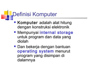 Dokumen ini menjelaskan pengenalan dasar komputer, termasuk definisi, komponen utama (hardware, software, brainware), dan berbagai jenis komputer (analog, digital, hybrid). Selain itu, dijelaskan juga peranan komputer dalam berbagai bidang kehidupan seperti pendidikan, bisnis, industri, perbankan, kedokteran, penerbangan, dan kriminalitas. Penekanan pada kemampuan komputer dalam meningkatkan efisiensi, akurasi, dan aksesibilitas dalam pengolahan data serta aplikasi di berbagai sektor.