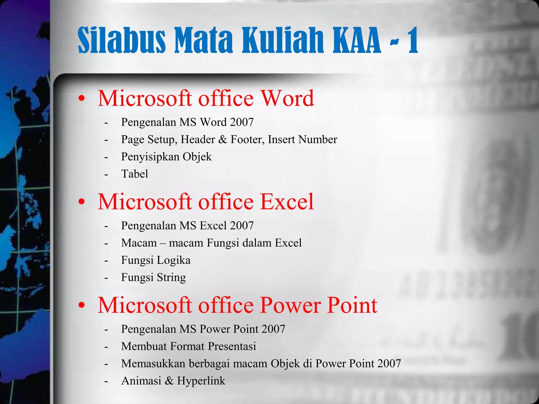 Silabus mata kuliah KAA-1 mencakup pengenalan dan penggunaan Microsoft Office Word, Excel, dan Power Point 2007, termasuk fitur-fitur dasar dan lanjut seperti page setup, tabel, fungsi, dan animasi. Penilaian terdiri dari kehadiran, tugas, UTS, dan UAS."