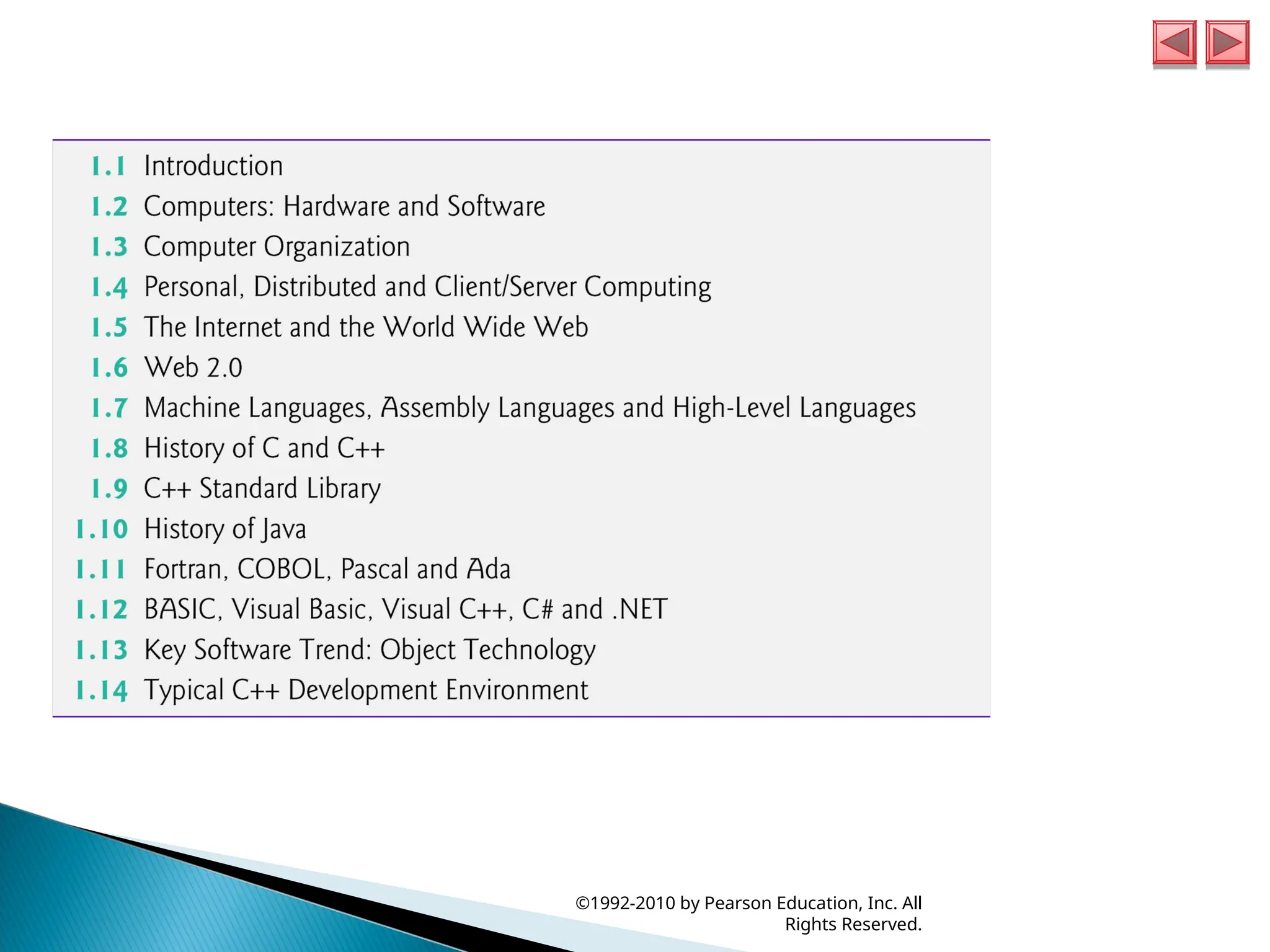 (Beginner’s All-purpose Symbolic Instruction Code) programming language was developed in the mid-1960s at Dartmouth College as a means of writing simple programs. ◦ Primary purpose was to familiarize novices with programming techniques. Microsoft’s Visual Basic language was introduced in the early 1990s to simplify Windows application development ◦ One of the most popular programming languages. The .NET platform provides capabilities for creating and running applications that can execute on computers distributed across the Internet. Three primary programming languages ◦ Visual Basic (based on the original BASIC) ◦ Visual C++ (based on C++) ◦ Visual C# (based on C++ and Java; developed expressly for the .NET platform). ©1992-2010 by Pearson Education, Inc. All Rights Reserved.
