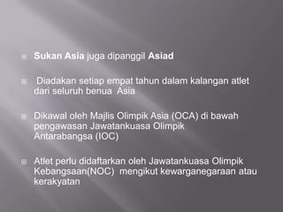 Sukan Asia, atau Asiad, diadakan setiap empat tahun dan melibatkan atlet dari seluruh benua Asia di bawah pengawasan Majlis Olimpik Asia. Kejohanan pertama berlangsung di Manila pada 1913, dan Sukan Asia pertama diadakan di New Delhi pada 1951. Malaysia telah menyertai 15 kali dan meraih 41 pingat, termasuk 9 emas, pada Sukan Asia 2010 di Guangzhou.