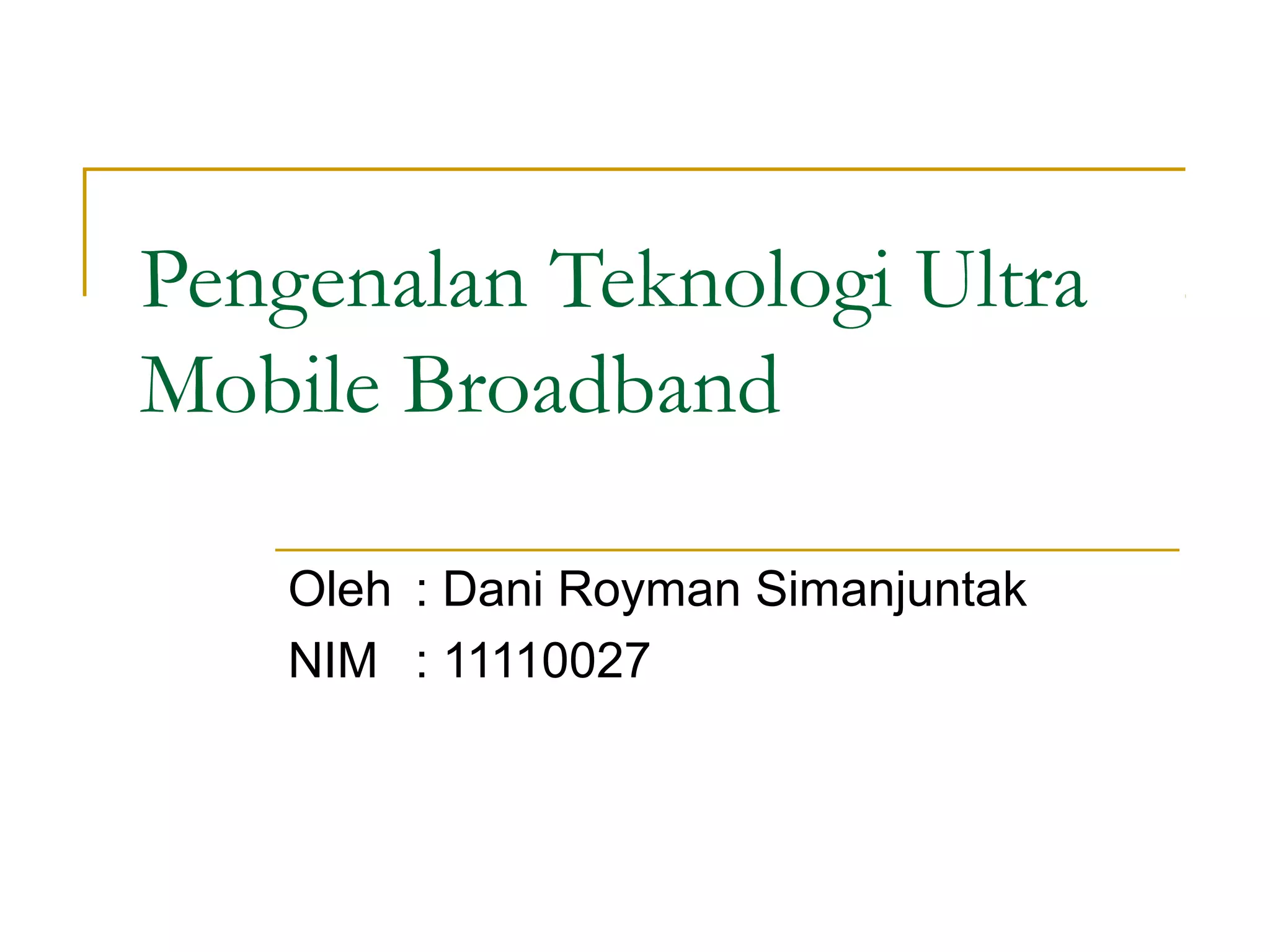 Dokumen ini membahas teknologi Ultra Mobile Broadband (UMB) yang diperkenalkan pada tahun 2009 sebagai evolusi dari CDMA2000, bertujuan untuk memberikan komunikasi generasi keempat dengan kemampuan transfer data hingga 288 Mbps. UMB dirancang untuk perangkat mobile dengan arsitektur protokol yang mendukung manajemen jaringan yang skalabel dan dukungan untuk aplikasi multimedia. Kesimpulannya, pergeseran ke arsitektur berbasis IP sangat penting untuk memberikan layanan baru secara efisien dalam jaringan seluler.