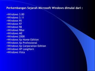 Dokumen ini memberikan pengantar tentang Windows XP, termasuk sejarah dan proses instalasinya, serta spesifikasi hardware dan software yang dibutuhkan. Selain itu, dokumen juga menjelaskan berbagai elemen antarmuka pengguna seperti wallpaper, ikon, taskbar, dan folder, serta pola latihan penggunaan file dan folder. Informasi ini bertujuan untuk membantu pengguna memahami dan menggunakan Windows XP secara maksimal.