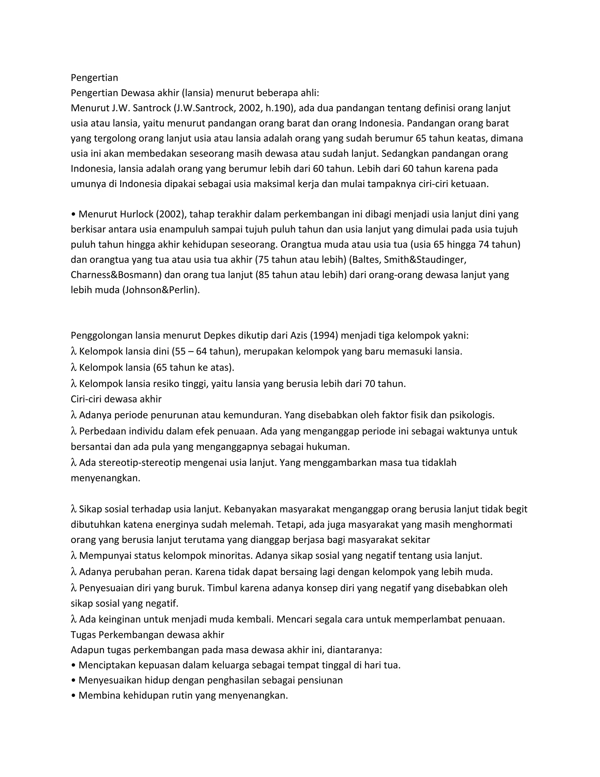 Dokumen tersebut menjelaskan pengertian dewasa akhir (lansia) menurut beberapa ahli yang berkisar antara usia 55-65 tahun. Ia juga membahas ciri-ciri fisik, kognitif, pekerjaan, sosial, emosional, spiritual dan minat pada masa dewasa akhir serta tugas perkembangannya.