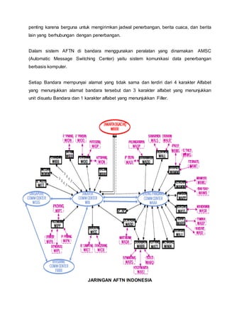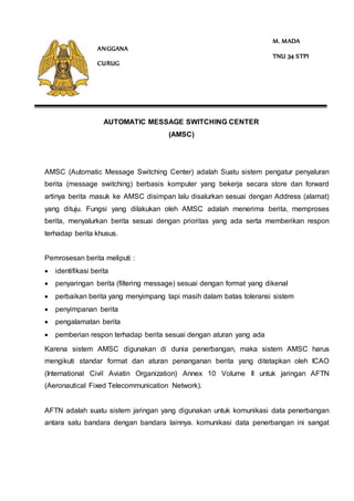 Automatic Message Switching Center (AMSC) adalah sistem berbasis komputer yang mengatur penyaluran berita penerbangan dengan metode store and forward. AMSC mengikuti standar ICAO dan digunakan dalam jaringan Aeronautical Fixed Telecommunication Network (AFTN) untuk komunikasi data antara bandara, seperti pengiriman jadwal penerbangan dan berita cuaca. Setiap bandara memiliki alamat unik dan format berita AFTN terdiri dari heading, address, origin, text, dan ending.