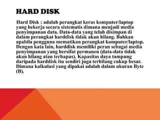 Hard disk adalah media penyimpanan permanen pada komputer yang menyimpan data yang tidak hilang meskipun perangkat dimatikan. Ia terdiri dari beberapa komponen penting seperti pelat, spindle, dan read-write head, serta berbagai teknologi seperti RAID dan SMART untuk meningkatkan kinerja dan keandalan. Hard disk juga dapat terpengaruh oleh guncangan fisik, pemadaman listrik yang tiba-tiba, dan suhu yang tinggi yang dapat merusak data yang tersimpan.
