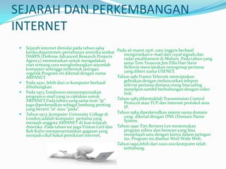 Dokumen ini menjelaskan sejarah dan perkembangan internet dari tahun 1969 hingga saat ini, mencakup penciptaan ARPANET, email, dan World Wide Web. Internet memungkinkan layanan real-time dan komunikasi langsung antara pengguna dengan berbagai bentuk akses, termasuk melalui perangkat mobile. Dokumen juga menyebutkan tantangan terkait pelanggaran hukum dan tata tertib penggunaan internet di Indonesia.