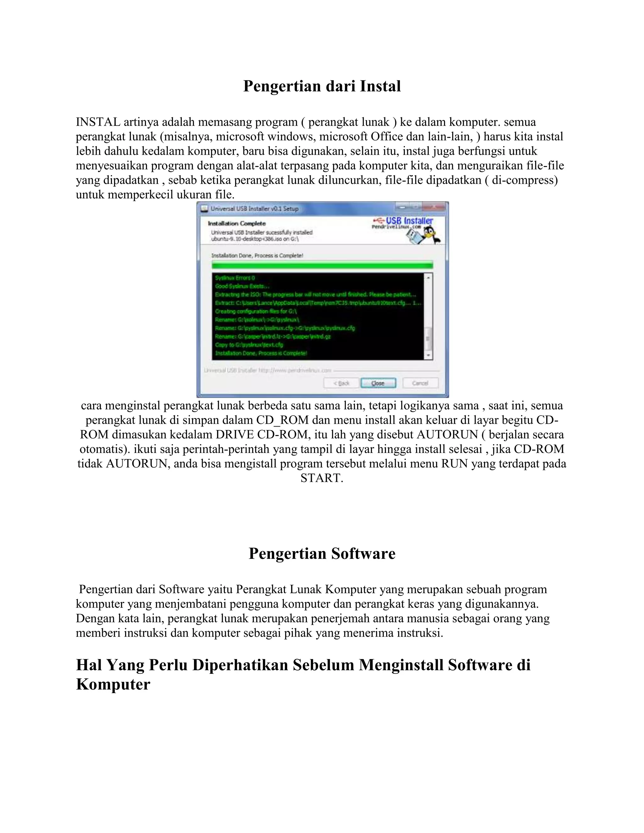 Dokumen ini menjelaskan pengertian dan proses instalasi perangkat lunak (software) di komputer, termasuk tips untuk memastikan kesesuaian antara software dan spesifikasi komputer. Selain itu, dibahas juga pengertian sistem operasi dan jenis-jenis software yang ada, seperti software aplikasi, bahasa pemrograman, dan sistem operasi. Penekanan diberikan pada pemilihan software yang tepat dan cara menghindari masalah saat instalasi.