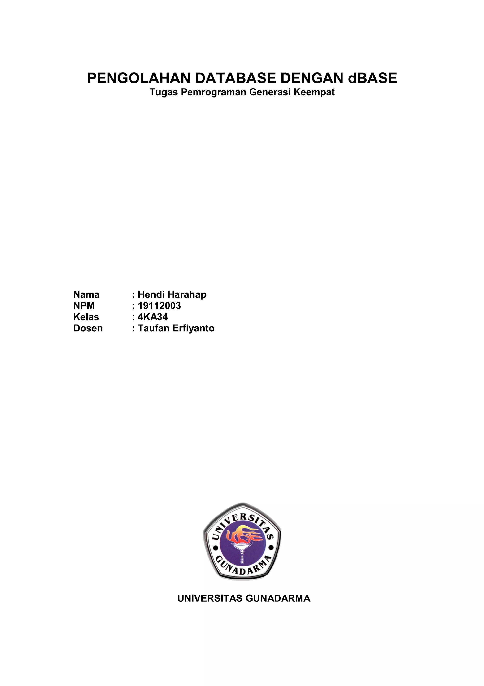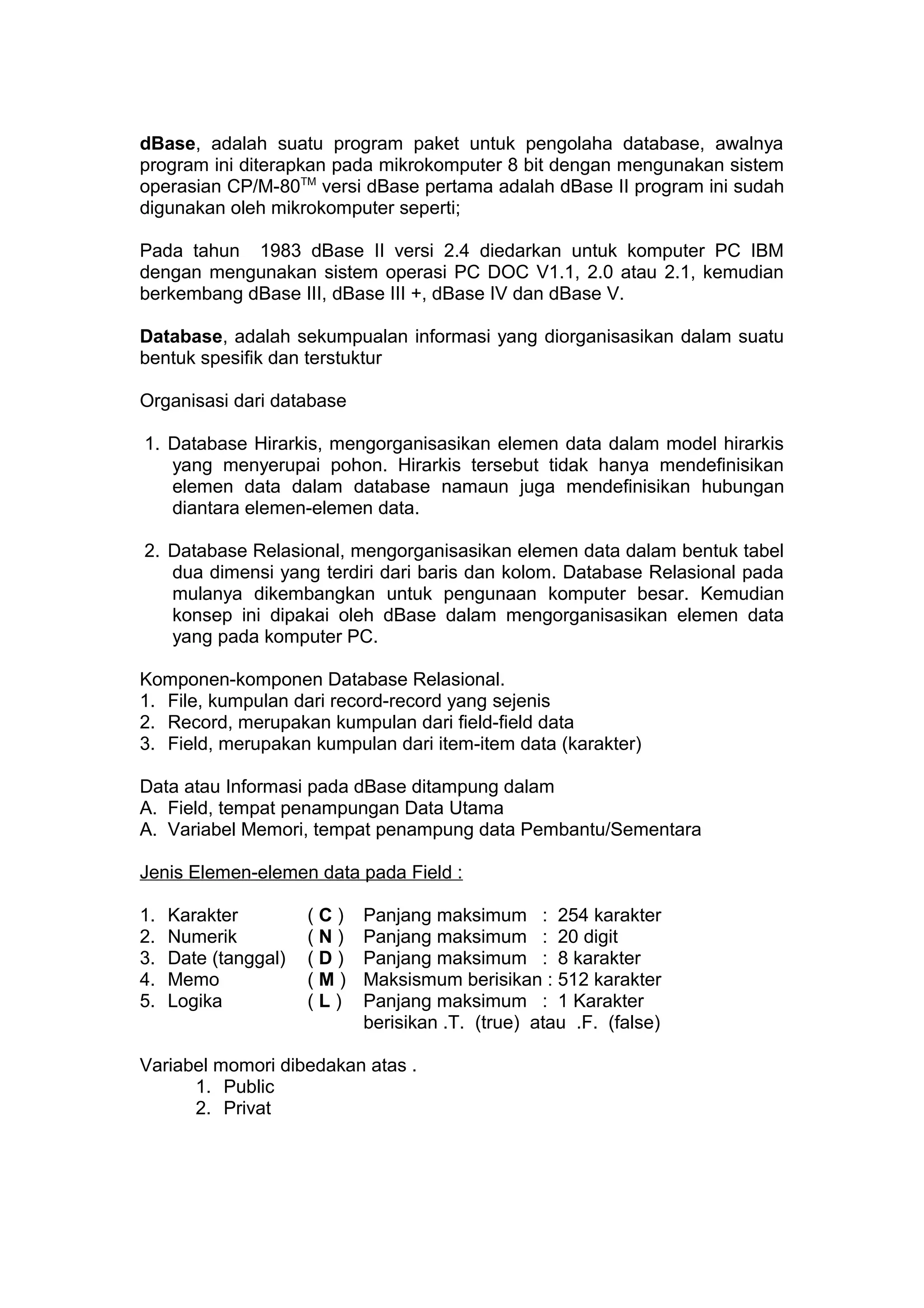Dokumen ini menjelaskan tentang pengolahan database menggunakan Dbase, termasuk sejarahnya, struktur dan jenis database, serta perintah-perintah yang digunakan untuk memanipulasi data. Dbase menyediakan berbagai tipe file dan operasi untuk pengaturan informasi seperti penghapusan, pencarian, dan pengeditan data. Selain itu, dokumen ini menyampaikan cara membuat dan mengelola file database serta perintah interaktif yang dapat digunakan dalam sistem Dbase.