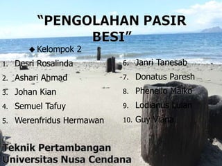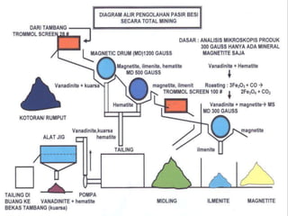 Alat-alat yang digunakan dalam pengolahan pasir besi meliputi belt conveyor, trommel screen, magnetic drum separator, dan humprey spiral. Tahapan pengolahannya terdiri dari pemisahan pasir besi dan pengotor, pemisahan konsentrat dan tailing menggunakan magnetic drum separator berbeda gauss, hingga diperoleh konsentrat magnetite dan ilmenite serta tailing vanadinite, hematite, dan kuarsa.