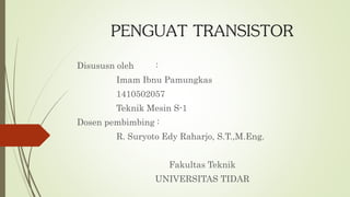 Dokumen tersebut membahas tiga jenis penguat transistor, yaitu penguat common base, common emitor, dan common collector. Penguat common base memiliki isolasi tinggi antara output dan input serta impedansi input tinggi, sehingga cocok untuk preamplifier. Penguat common emitor sering digunakan pada penguat frekuensi rendah karena output berlawanan fase dengan input. Sedangkan penguat common collector cocok sebagai buffer karena memiliki impedansi input tinggi dan output rendah.