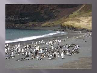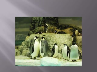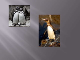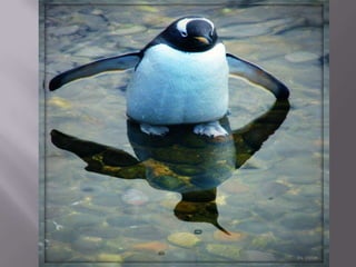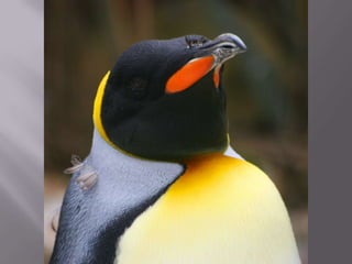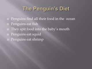 Penguins find their food in the ocean such as fish, squid, and shrimp. They have black and white feathers and streamlined bodies for swimming, with short necks, webbed feet, and razor-sharp beaks. Penguins live in cold coastal areas around Antarctica, South Africa, New Zealand, Australia, Chile, Peru, and the Galapagos Islands, keeping their eggs warm in nests until the chicks grow large enough to be fed by regurgitation.