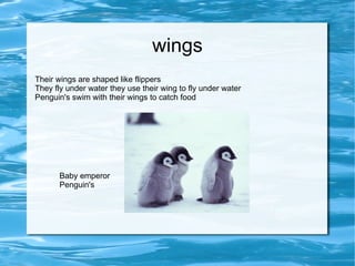 There are many different types of penguins that vary in size, appearance, and habitat. Penguins can be found in cold, temperate, and even tropical regions around the world. They are expert swimmers that use their wings like flippers to catch food underwater. While penguin species differ, they all rely on fish, squid, and krill as their primary food sources.